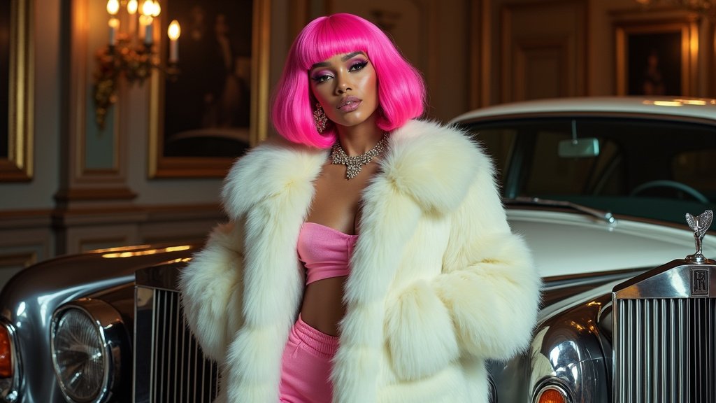 The announcement of “Imaginary Players” was accompanied by a striking new photo of Cardi B, providing a visual preamble to the music‘s aesthetic. In the image, the artist exudes an aura of opulent cool, sporting a vibrant pink wig that commands attention. This playful yet bold choice in hair color is juxtaposed with the luxurious texture of a pristine white faux fur coat, draped elegantly around her. The combination of the vivid wig and the sumptuous coat creates a look that is both high-fashion and undeniably her own, blending extravagance with a distinct personal flair.